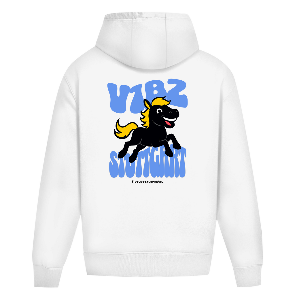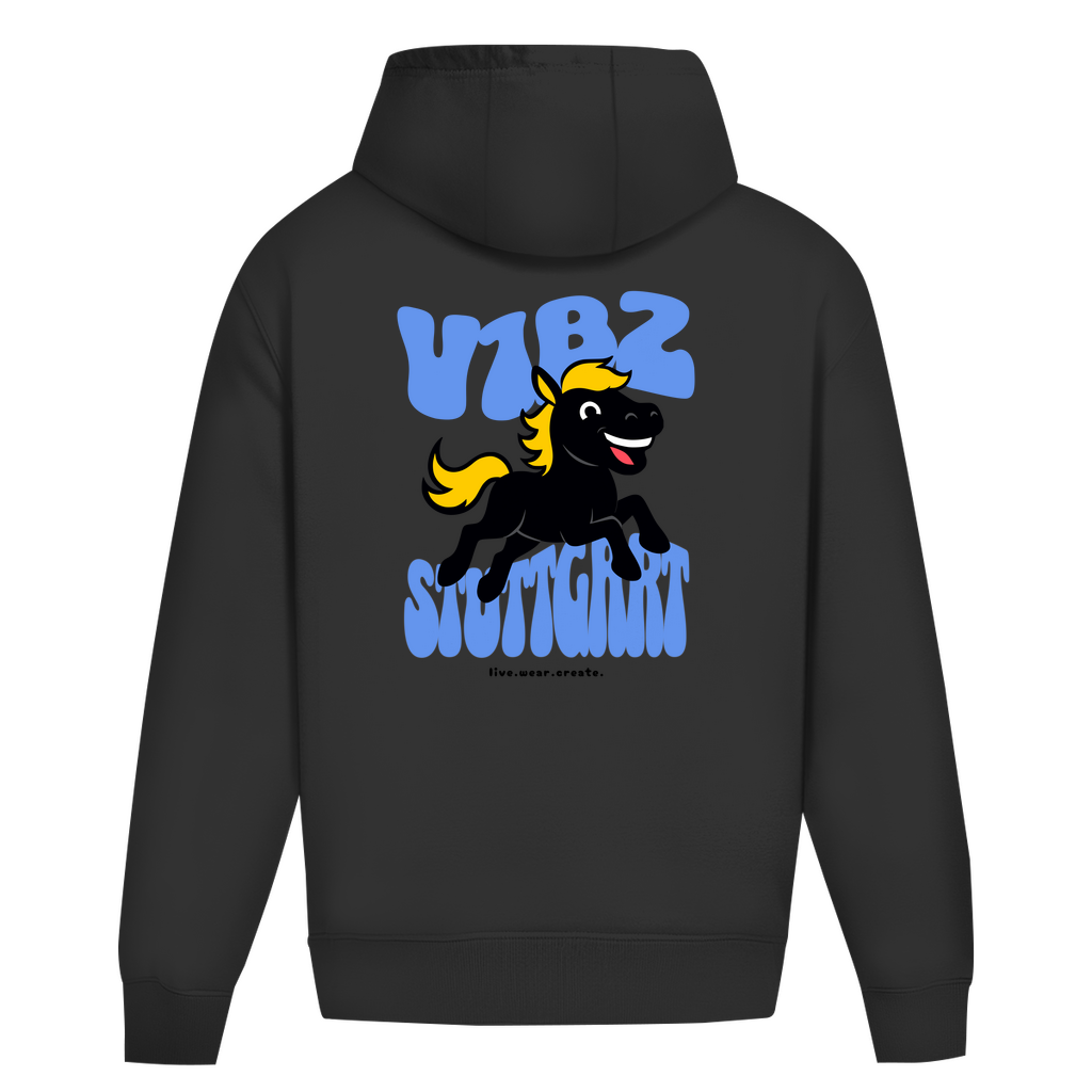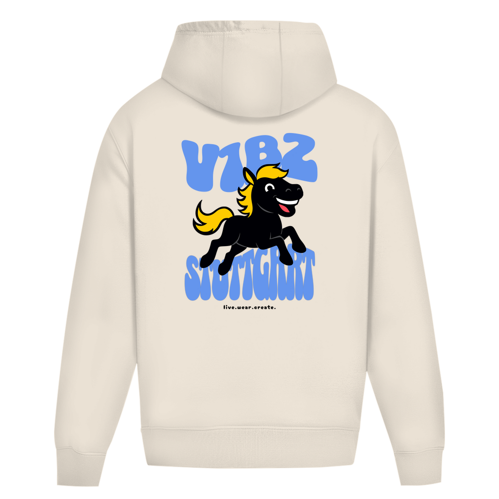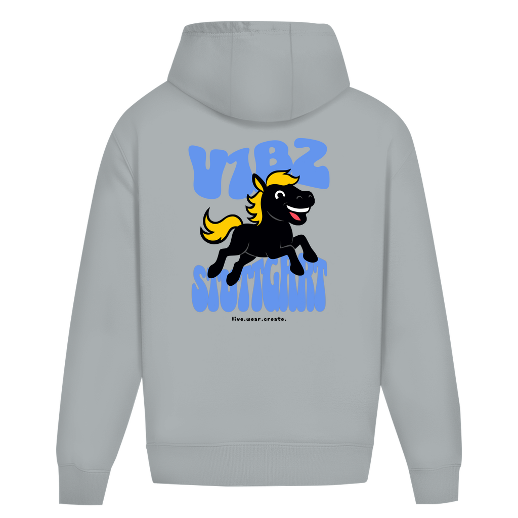 Heavyweight oversized hoodie with a boxy fit. Front box logo with v1bz branding, back with exclusive design. Printed in Germany.